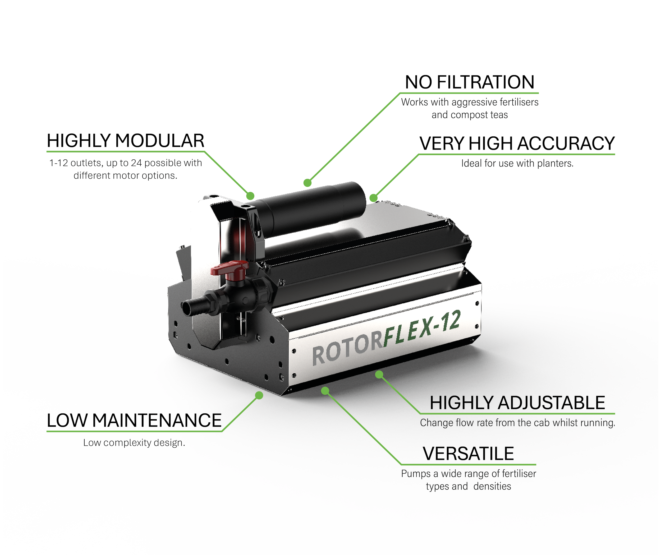 Our solution, the RotorFlex, is designed with these requirements and challenges in mind. Its unique peristaltic design overcomes the problems with existing fertiliser pump systems, whilst its simple modular design means its extremely easy to maintain and adapt to your application.
